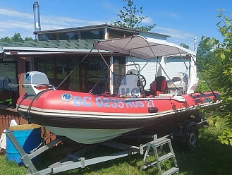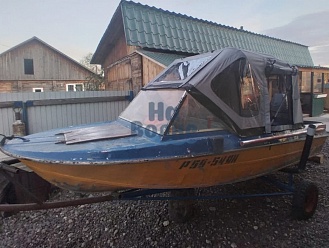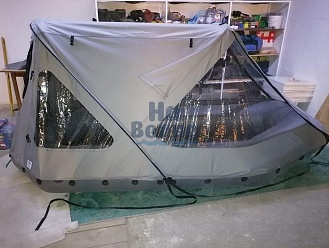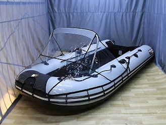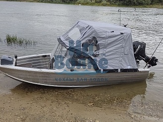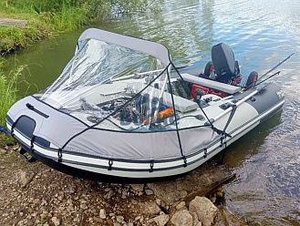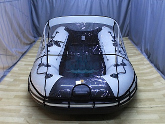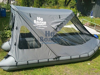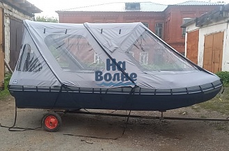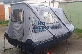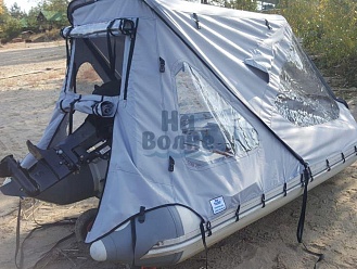 Тент с задней дверью для выхода к мотору, небольшими боковыми окнами и усиленными краями для установки застёжек. Изготовлен из специализированной тентовой ткани Оксфорд 600 повышенной плотности